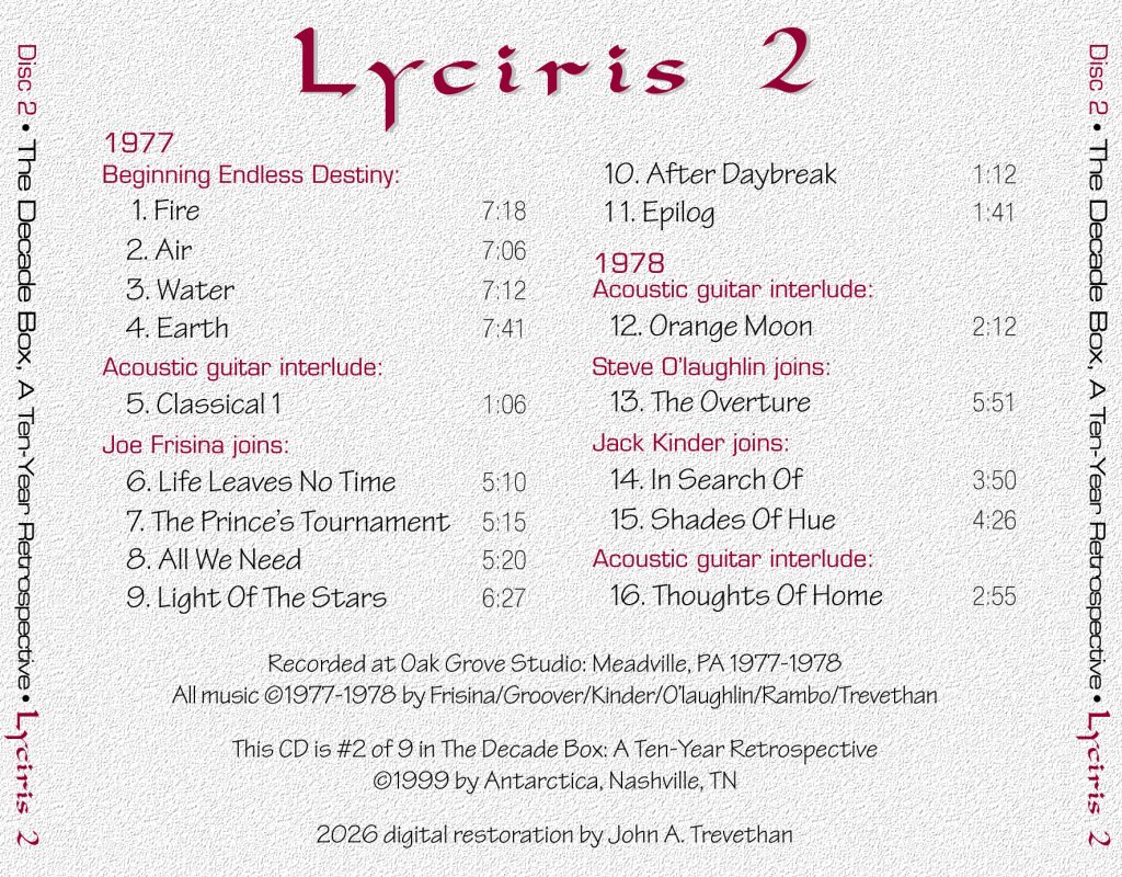 Lyciris II v3: Brian Groover-bass, flute, vocals | Jack Kinder-vocals | Steve O'Laughlin-drums | Denny Rambo- guitar | John Trevethan-guitars, keyboards